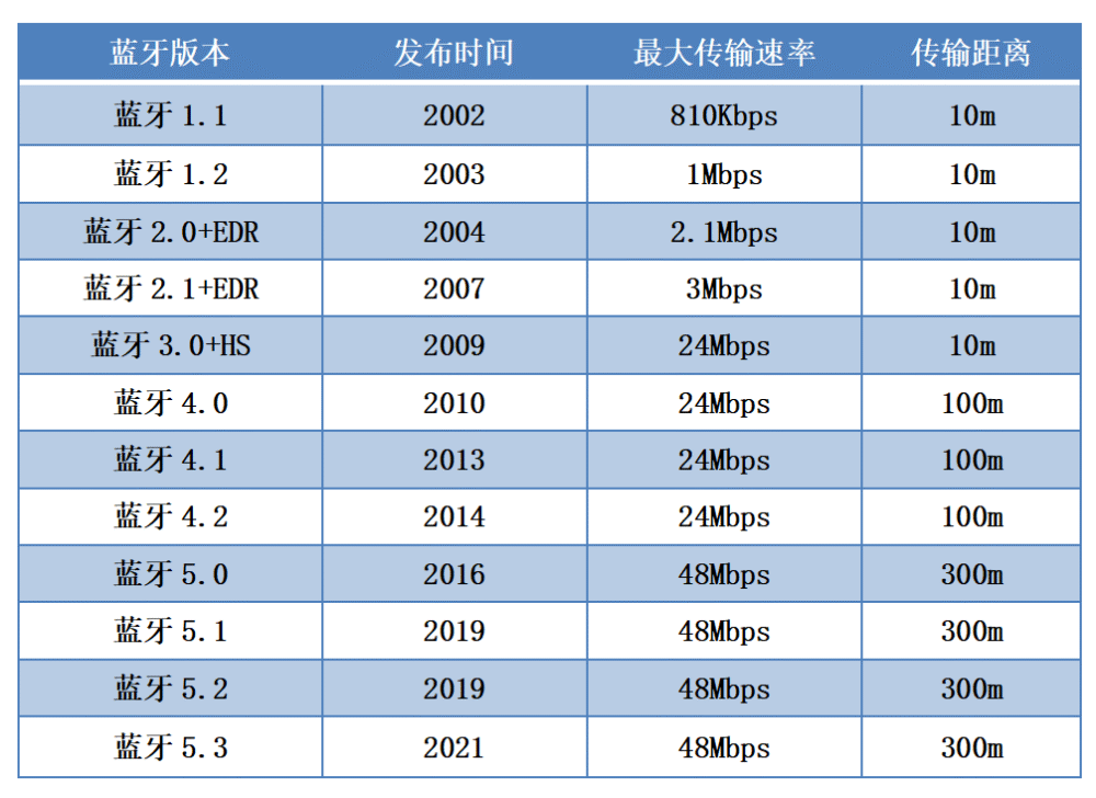 不断更新的蓝牙协议升级了哪些功能? 蓝牙作为一种小范围无线连接技术,具有低功耗、低成本、方便快捷的特点,被广泛应用于无线耳机、智能手表、无线遥控等场景,是实现无线通信的主流技术之一。 自1999年第一个蓝牙版本诞生,蓝牙技术已经发展了20余年,从蓝牙1.0到蓝牙5.3,不断更新的蓝牙协议升级了哪些功能? 蓝牙1.0 传输速率748~810kpbs,单工传输,通信易受干扰,难以区分主副设备。 蓝牙1.1 传输速率在748~810kpbs,只能以单工的传输方式进行工作,容易受到同频率产品的通信干扰,已可进行主副设备区分。该版本支持Stereo音效的传输要求,但是频宽、频率、响应时间等参数指标达不到要求,也不算是一个应用在Stereo传输上最好的协议。 蓝牙1.2 传输速率未变,在蓝牙1.1版本的基础上 ,增加了抗干扰跳频功能,支持单通道播放,但是性能还是不理想。 蓝牙2.0 蓝牙2.0是1.2的优化提升版本,传输速率能达到2Mpbs左右。该版本蓝牙模块可以实现全双工的工作方式,可以在传输文件的同时传输语音信息,进行实时双向通信。功耗相对降低,开始支持立体声。 蓝牙2.1 该版本蓝牙模块具备了手机间的配对和近场通讯NFC(Near Field CoMMunication)机制; Sniff Subrating功能:可以实现设定两个设备间的确认数据发送间隔,当我们延长这个时间间隔就可以让蓝牙芯片的功耗降低。 该版本的蓝牙协议支持全双工通信模式,数据可实现实时双向交互。 蓝牙3.0 使用全新的协议,传输速率能够达到24Mbps,传输速率在蓝牙2.0的基础上大大提升,支持视频传输。 蓝牙4.0 实现极致的低功耗;低成本、低时延,可实现3ms的低延迟,还有AES-128加密,在保证性能的前提下实现较高的安全性。设备可多连,理论上能够实现100米的距离传输。 4.0以后的蓝牙版本属于低功耗蓝牙。 蓝牙4.1 实现通过IPV6协议连接到网络,提升用户入网便捷性和使用体验; AES加密技术:通过硬件加密技术让我们获得更加安全的连接。 蓝牙4.2 通过6LoWPAN接入互联网,提升数据传输速率;传输速率提升,安全性加强。 蓝牙5.0 更先进的蓝牙芯片,支持左右声道独立接收音频,数据处理能力更强、延迟更低。 提升传输距离:可以达到300米 Beacon:提供广播服务 无损传输:支持24bit/192KHz的无损音源传输 蓝牙5.1 AOA功能:可以实现室内定位误差1m内,室内定位更加精准。 蓝牙5.2 传输速率42Mbps,理论传输距离300米。增加了增强型ATT协议,LE功耗控制和LE同步信道等功能。 多主多从:主从一体角色下可同时连接7个从设备,并且可以作为从角色被另一个主角色设备连接。 Long Range模式:有效提高传输距离,增加通信范围。 支持大广播包:有效提升传输速率。 扩展广播包复用信道:复用37个信道传输,抗干扰能级强,传输快。 LE功率控制功能:根据信号强度变化来动态优化连接设备之间的传输功率,同时保证信号质量与减少功率浪费。 蓝牙5.3 传输速率与蓝牙5.2相同,延迟更低、续航更长、抗干扰能力更强。 支持包含广播数据信息(ADI)的周期性广播,有效提高通信效率; ADI包括广播数据ID(DID)及广播组ID(SID),广播数据ID主要用于区分不同的广播数据内容,广播组ID用于区分不同的广播组。 新增LE增强版连接更新功能,轻松实现低功耗; 新增LE频道分级功能,可减小设备间的相互干扰; 新增Host设定Controller密钥长度的功能,安全性提高; 彻底删除高速配置(HS)及相关技术规范。 综上,蓝牙版本越高,功能越强大。蓝牙版本向下兼容。 现在蓝牙版本的更新速度是很快的,相较于之前的版本,最新的蓝牙5.3在传输速率、稳定性、安全性等方面都有明显的提升,功能更强,应用也越多。 |